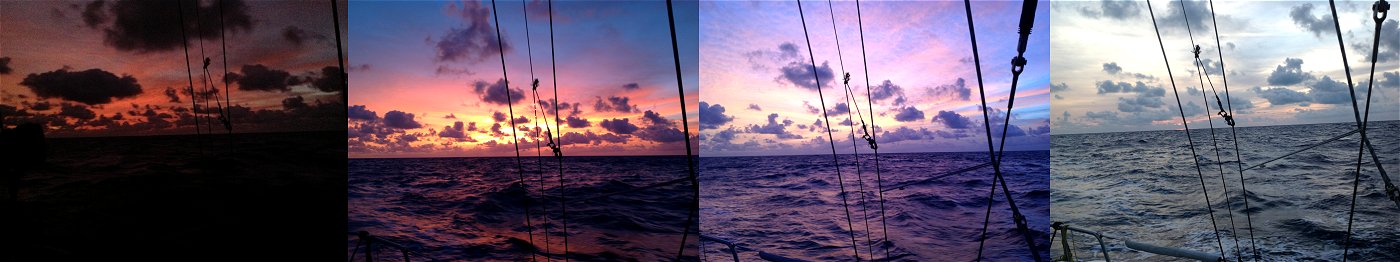 Zonsopgang op volle zee; wat een kleuren.