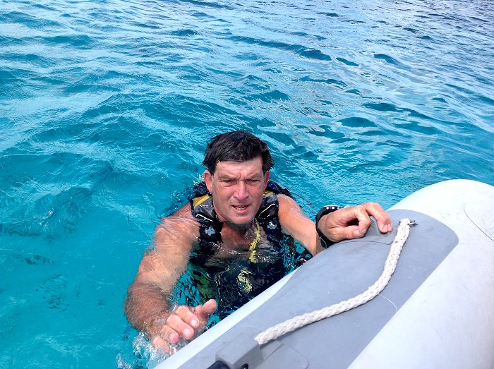 Hoewel het dus niet nodig is om met fles te gaan duiken, kan Jaap niet achterblijven. We hebben het carnaval van Trinidad al overgeslagen; we kunnen niet ook "divers-paradise-numero-uno" overslaan.