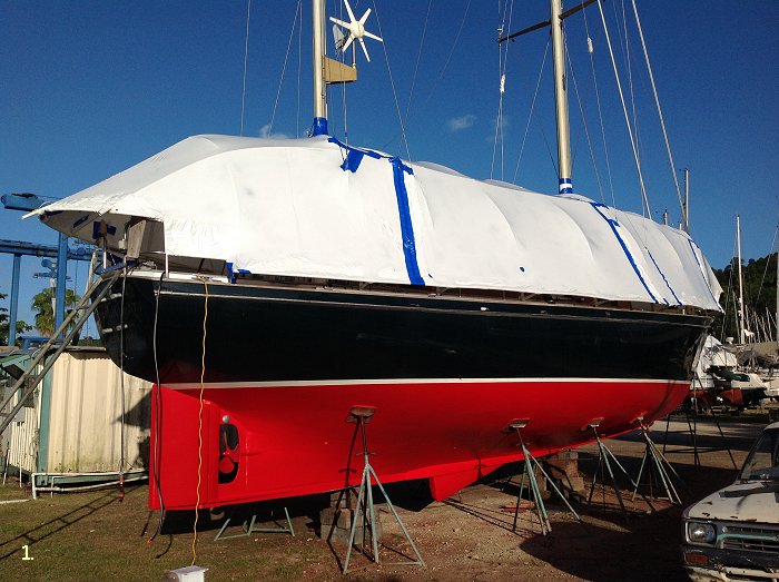 ontdaan van alle aangroei, de aandewindse zeilen zijn gehesen, de mast en het tuigage zijn gecontroleerd,