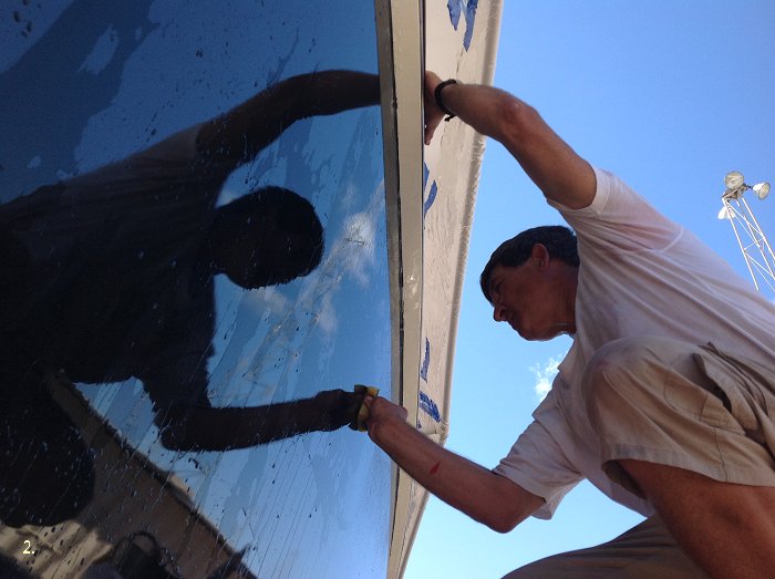 De kuip wordt geschilderd. Een uitdagende klus bij deze luchtvochtigheid en windsterkte.