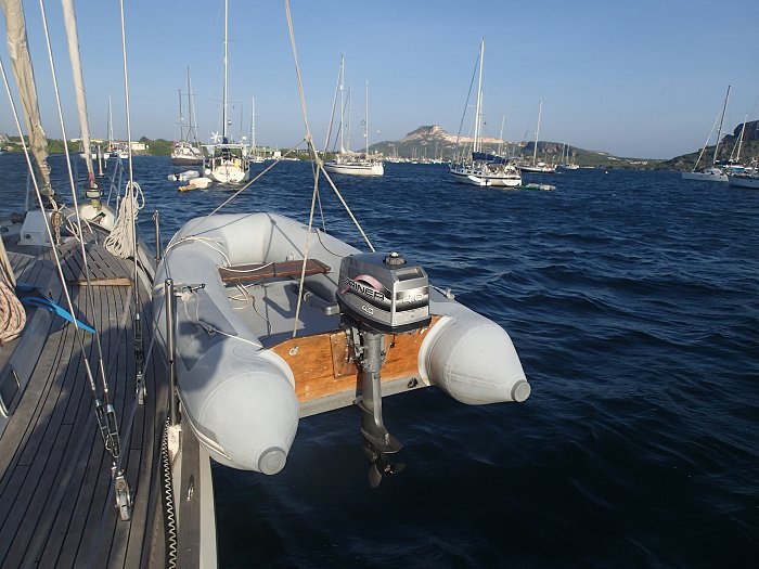 Aangezien wij nogal diefstal-gevoelig zijn, hijsen we braaf elke avond de bijboot uit het water. Zo blijft de onderkant ook mooi schoon.