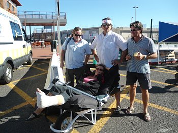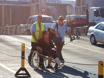 Het medisch team staat al klaar om Sue over te nemen van de ferry-begeleider