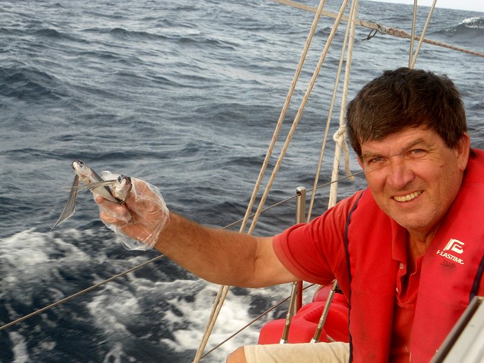 We find two flying fish in the cockpit. That´s not unusual. They fly closely above the water and on a large wave they fly on board. Stupid, because they don´t survive.