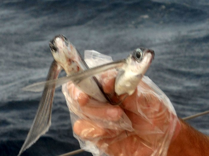 We vinden twee vliegende vissen in de kuip. Dat schijnt normaal te zijn. Ze scheren over het water en komen met een hoge golf de boot op vliegen. Dom, want ze overleven het niet.