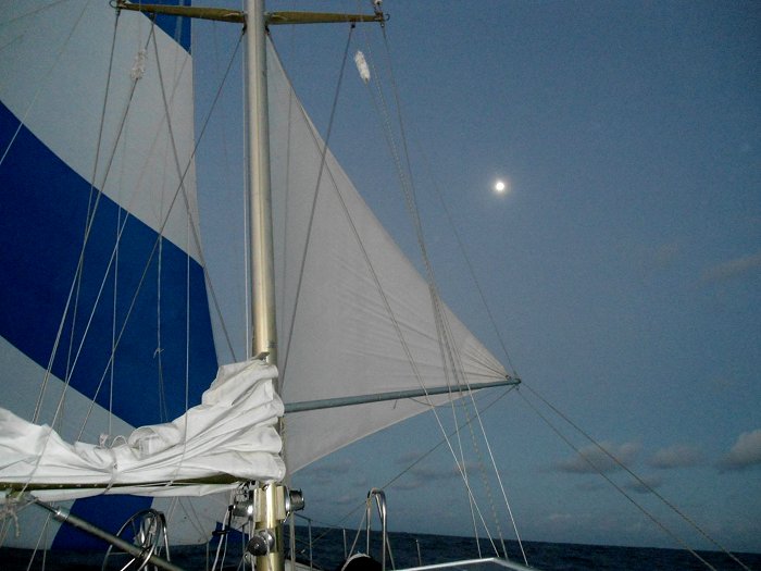 De wind trekt iets aan, en we lopen gemiddeld meer dan 6 knoop. Met deze wind en met een oceaan die doet denken aan de Grevelingen, piekeren we er niet over om voor de nacht de zeilen te reven. Het gaat prima zo.
