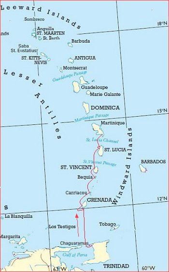 * De wind waait hier altijd uit het oostelijke quadrant. Tobago en Barbados zijn daarom moeilijk te bereiken. En als je te ver naar het westen raakt, wordt het steeds moeilijker om weer terug te komen.