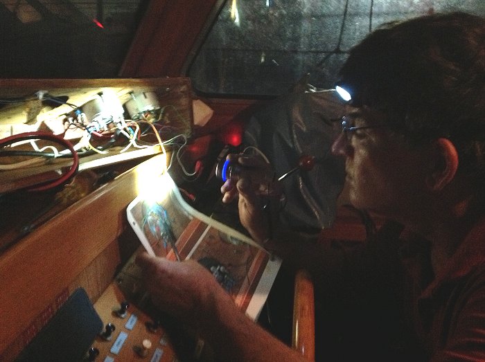 We geven onszelf een mooi cadeau: een nieuwe stuurautomaat (een Simrad/Robertson AP35). Noorse kwaliteit en stevig genoeg om een klein vissersschip mee de bocht om te krijgen. Met dit modelletje wordt niet geadverteerd, want er wordt te weinig op verdiend. Precies goed voor ons dus.