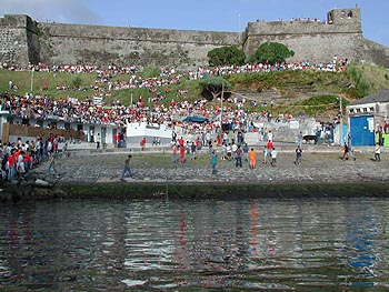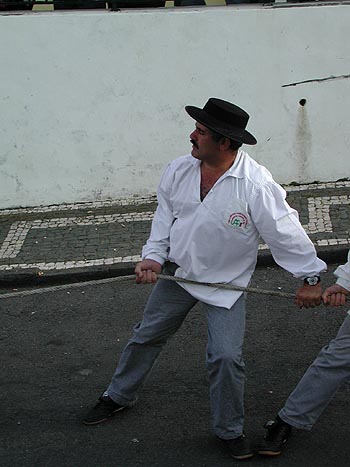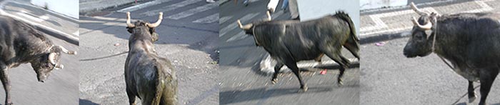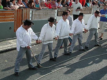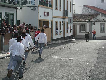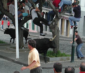Bij het Tourada a corda (onder) wordt slechts één stier losgelaten en geprikkeld om de mensenmeute op te jagen. De stier wordt dan aan een lange lijn gehouden.