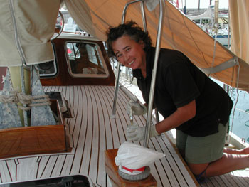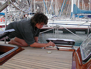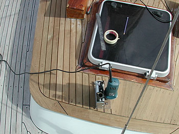 Bakboord geschuurd zonder naden en stuurboord geschuurd met nieuwe naden.