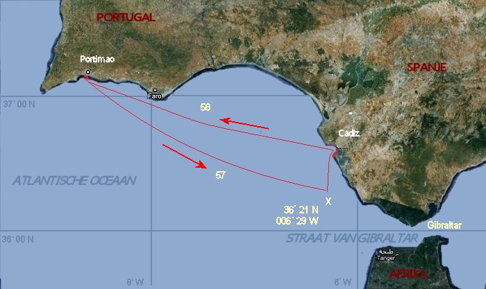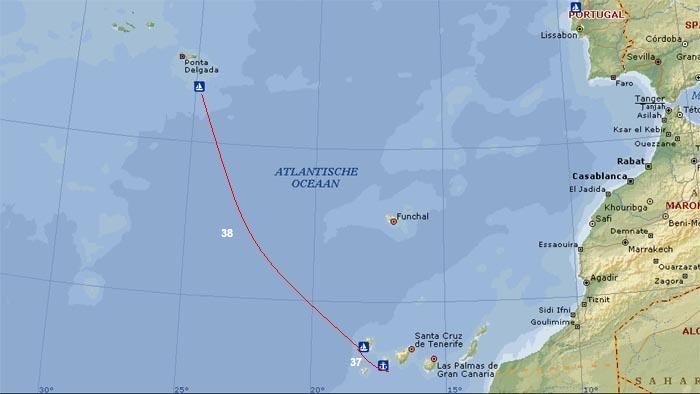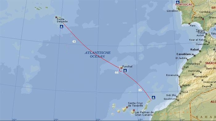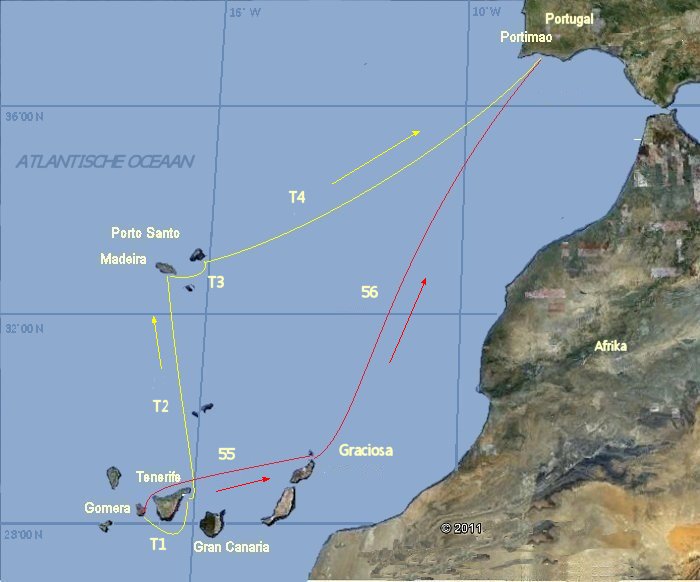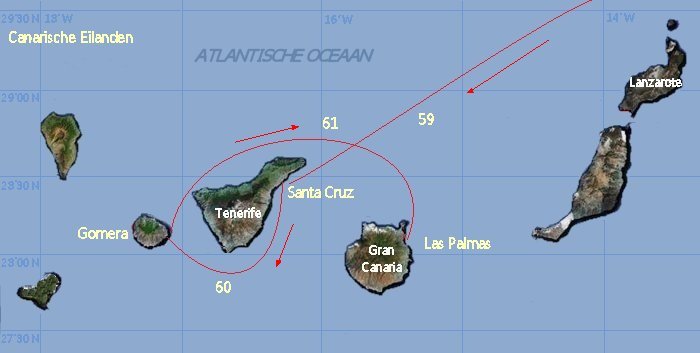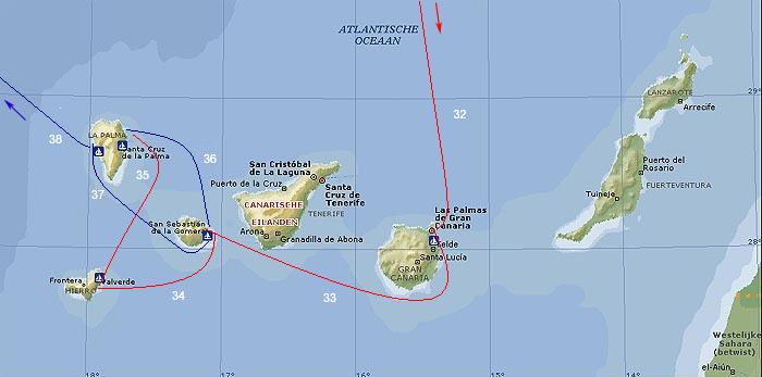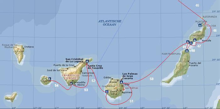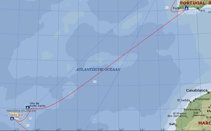 Etappe-plaatsen (werkelijk gevaren zeemijlen wijken af) |