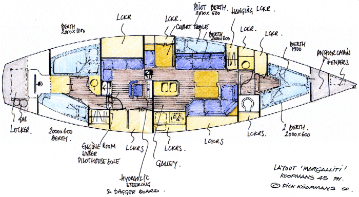 | Roerkoning: | Aluminium diam. 90 mm. Lagering tot boven de waterlijn, smering met vetpot. Roerkwadrant staal 30 x 30 cm. |